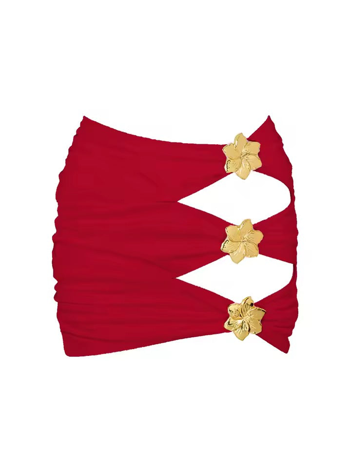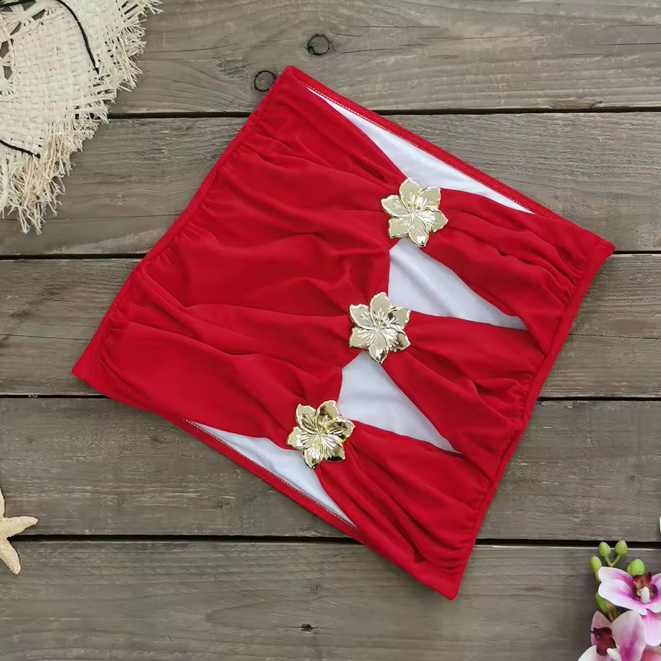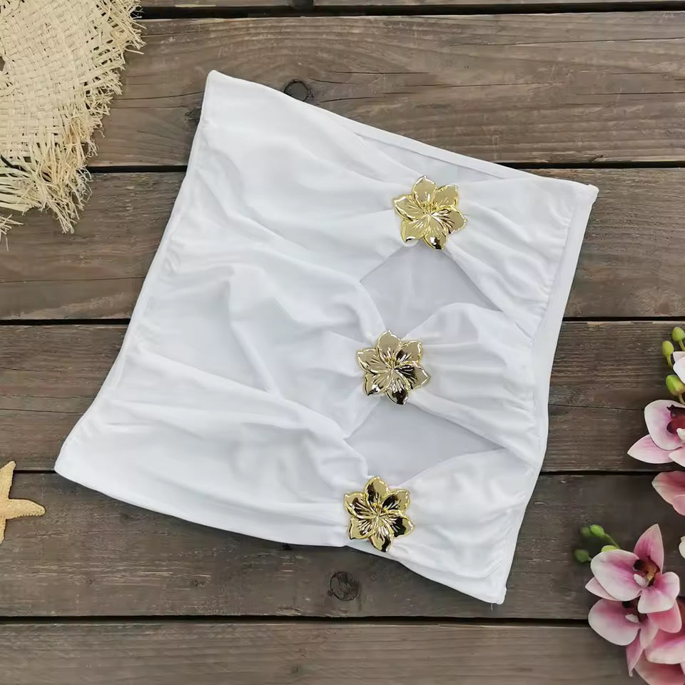 Bikini de una pieza, anudado al cuello, adornos dorados inncluidos, y falda pareo.