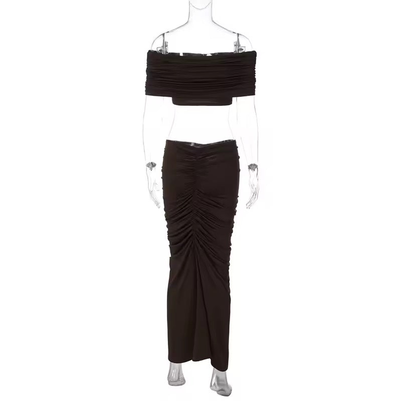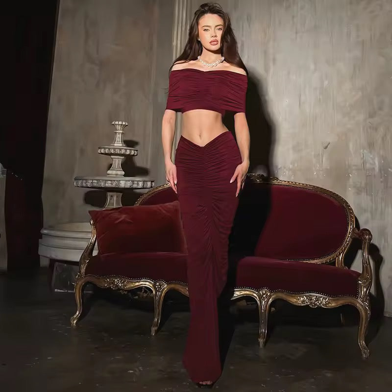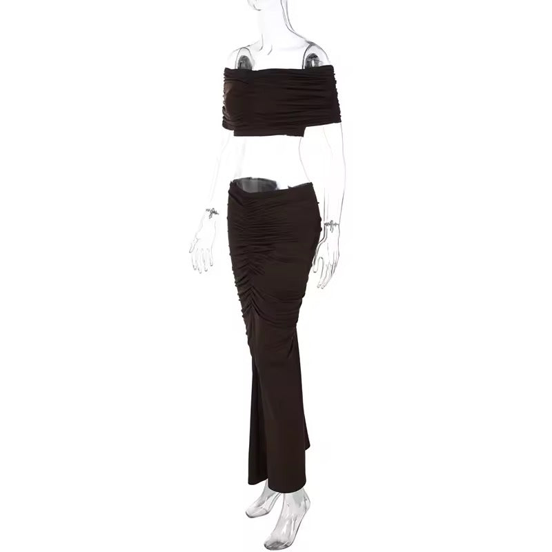Set de dos piezas, top estilo bandeja y falda ceñida al cuerpo.