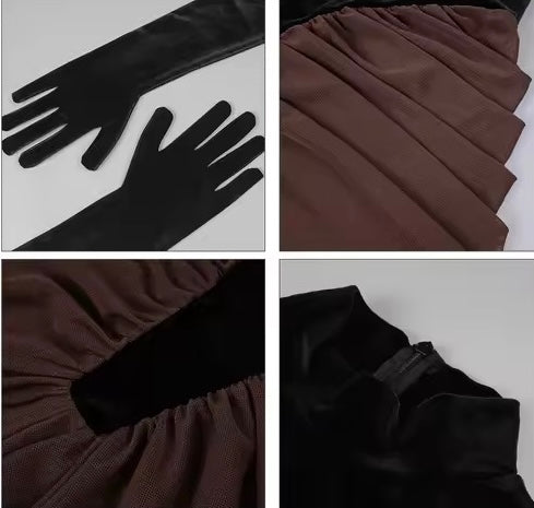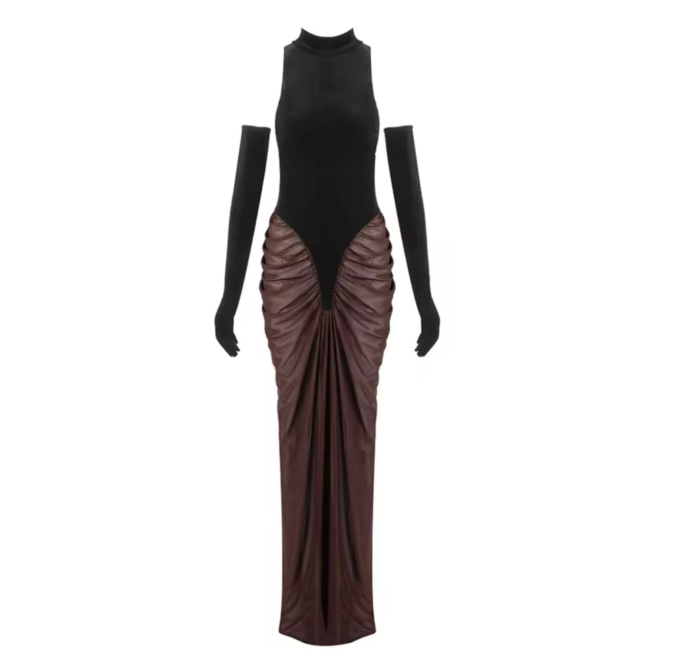 Vestido largo, cuello halter, bicolor negro y café.