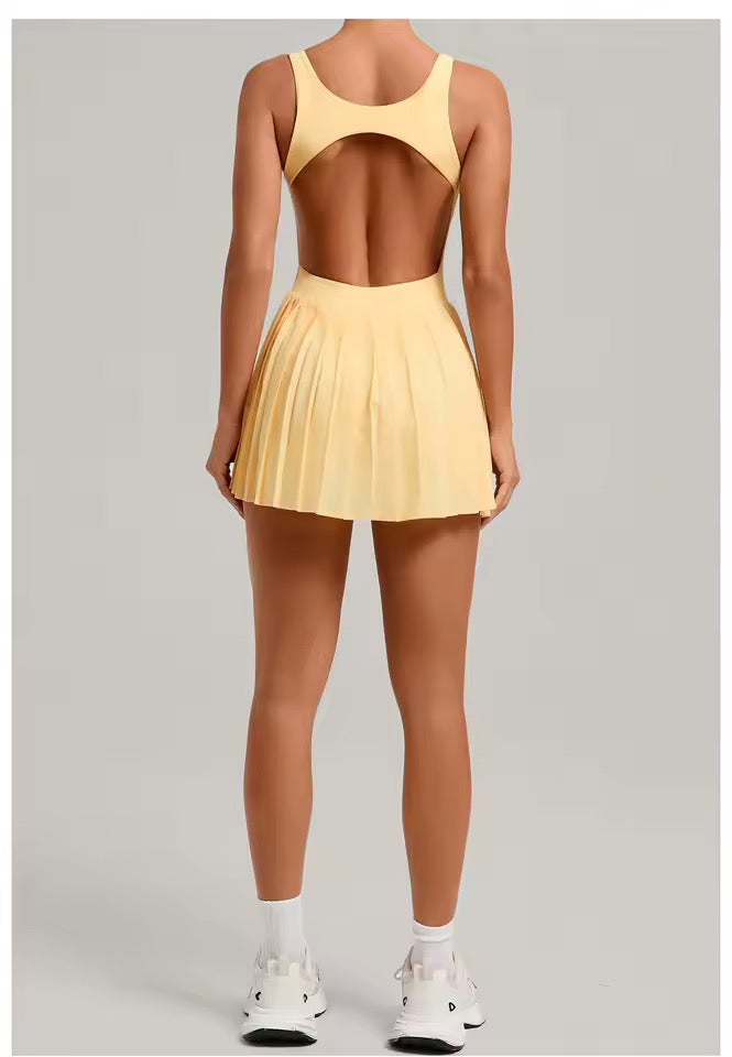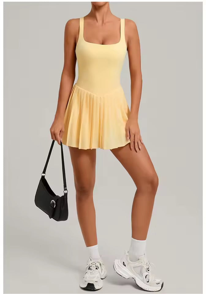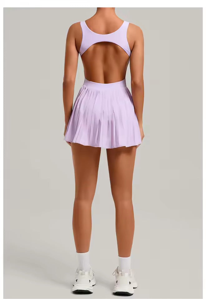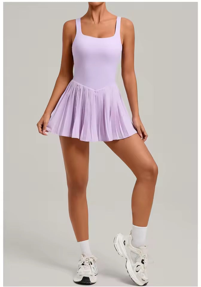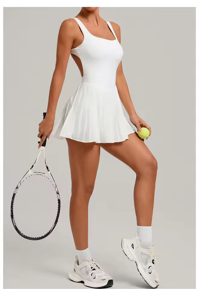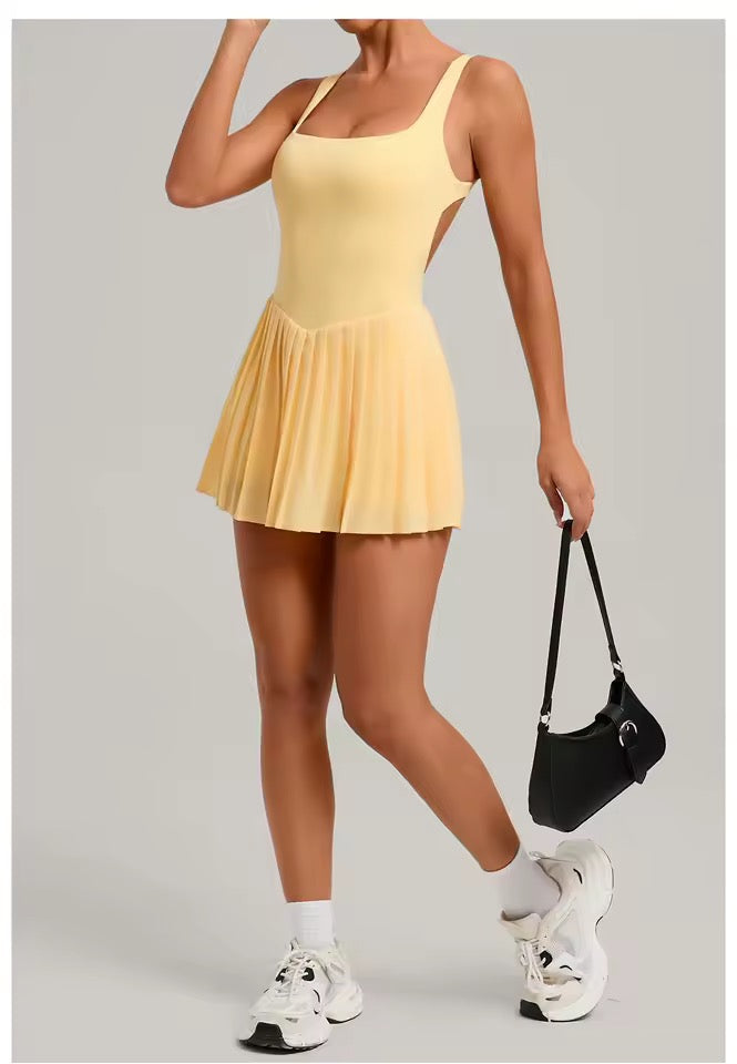 Enterizo deportivo corto, falda- short y bolsillo interno.