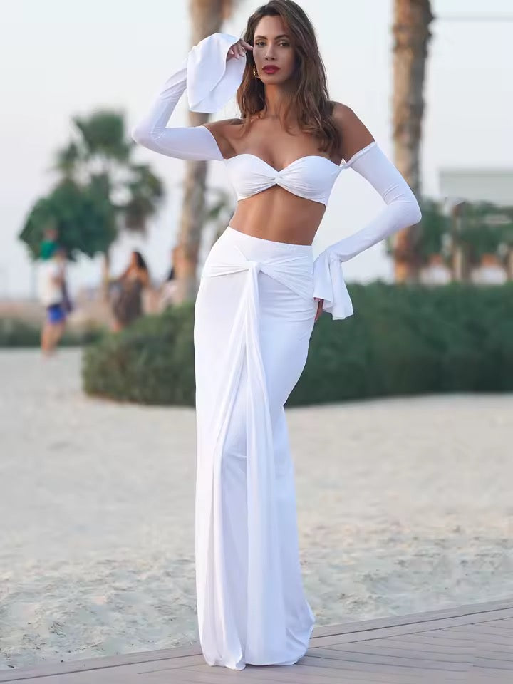 Set de dos piezas, top estilo bandeja, y falda larga.