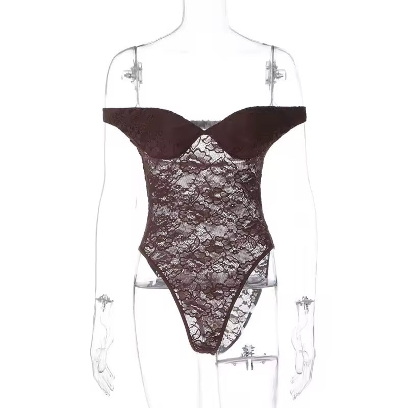 Set en encaje de dos piezas, body escote bandeja, y falda larga.