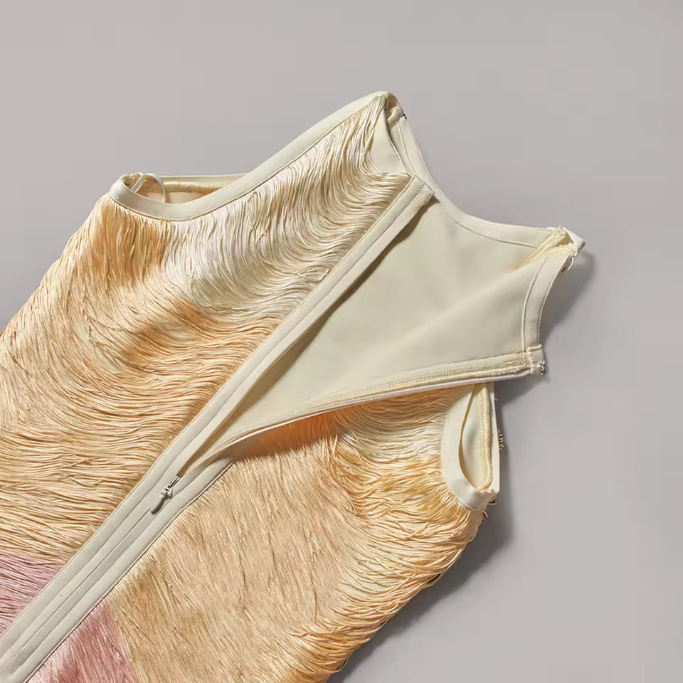 Vestido corto, trabajo manual de hilos sobre todo el vestido, cierre de cremallera parte trasera.